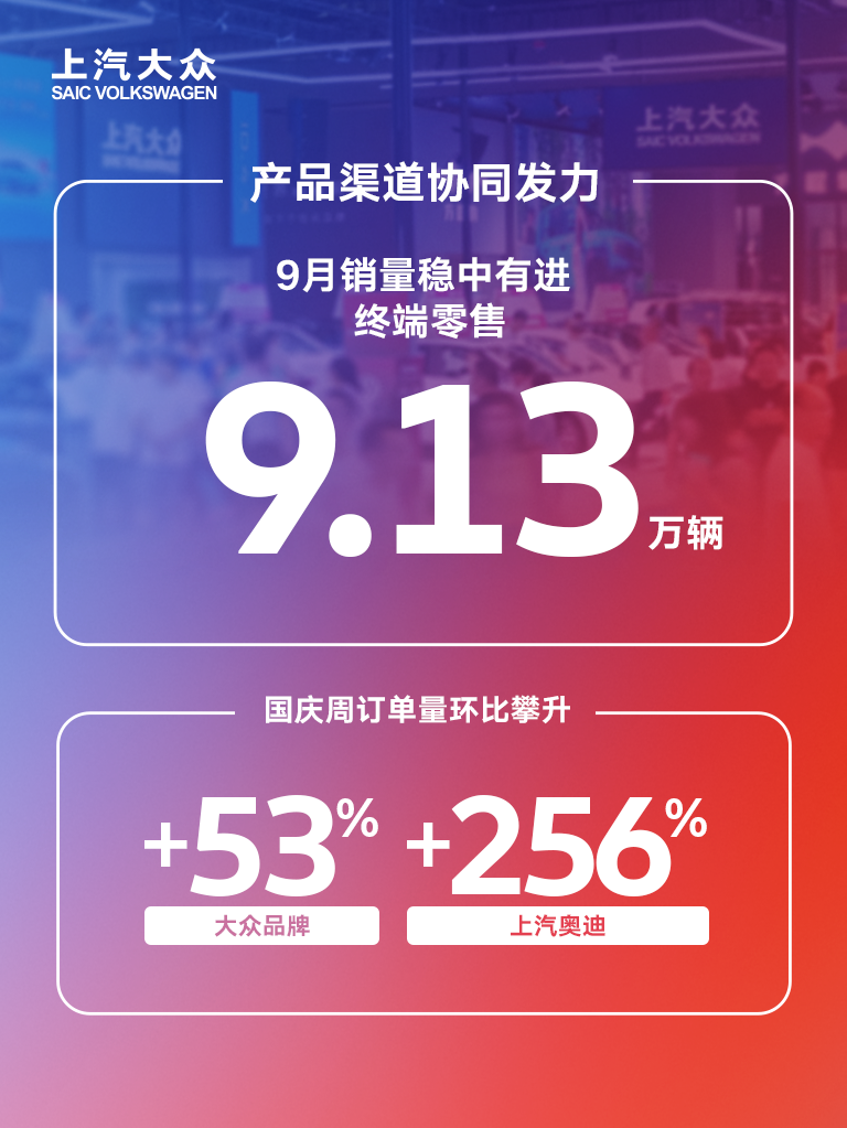 上汽大众最新发布的数据显示,9月上汽大众终端销售新车9.13万辆,前三季度累计销售78.7万辆。第三季度集中推出的多款新车持续转换为新的订单:黄金周期间,上汽大众大众品牌订单环比增加56%,上汽奥迪更交出了订单环比增长256%的成绩。