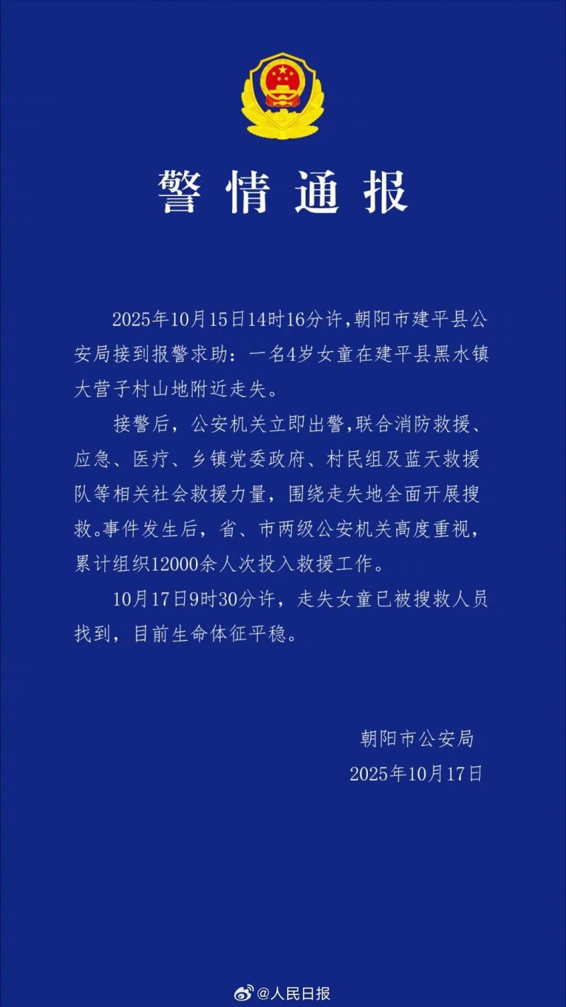 10月15日14时16分许,辽宁省朝阳市建平县公安局接到报警求助:一名4岁女童在建平县黑水镇大营子村山地附近走失。10月17日9时30分许,走失女童已被搜救人员找到,目前生命体征平稳。