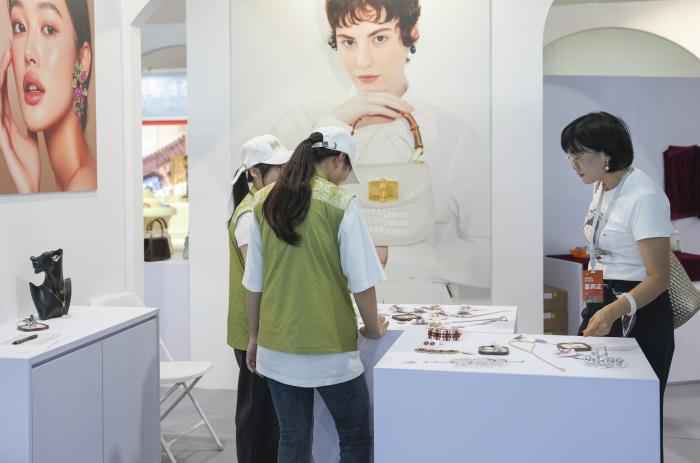 良渚文创市集活动包含国际文创、国内文创、中国城市礼物、知名文创等专题展区,举办对话沙龙、国潮时尚秀等活动,展示中外文创成果,开展交流合作。10月17日,观众在中外交流互鉴馆参观良渚文创产品展区。
