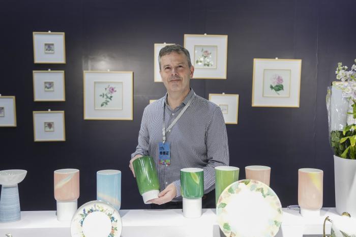 10月17日,来自英国的参展商在中外交流互鉴馆展示一款瓷器。