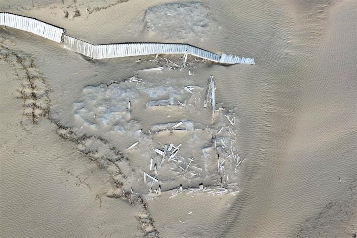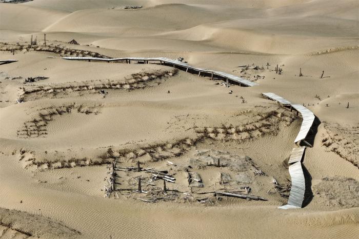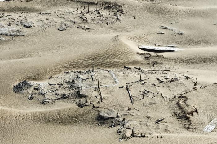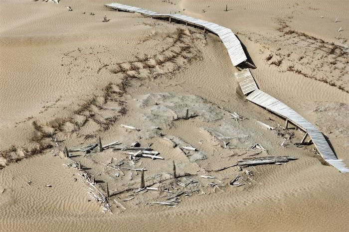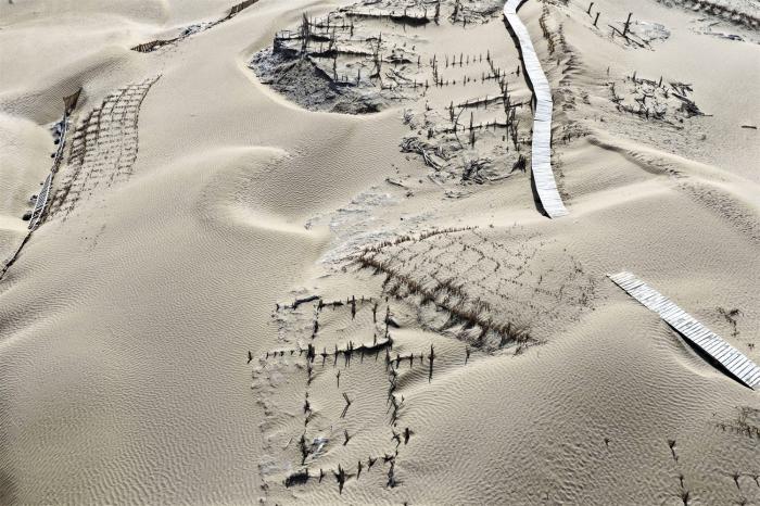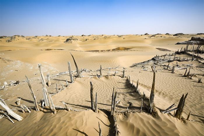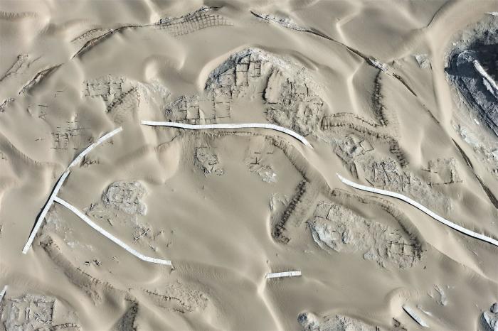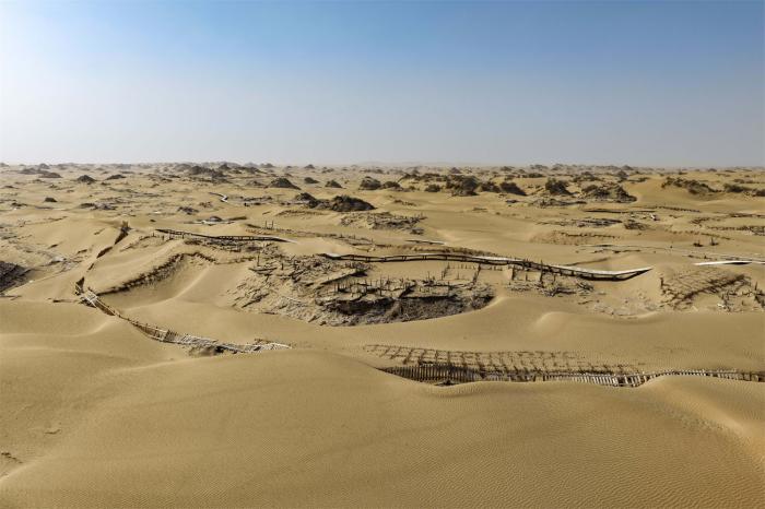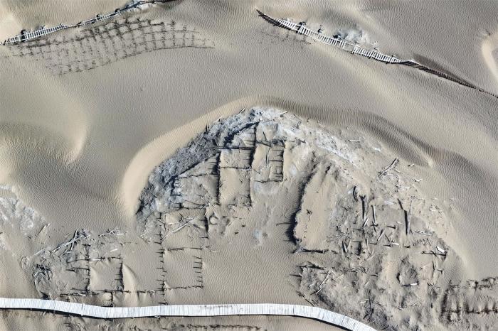 这是尼雅遗址内建筑遗迹等(无人机照片,10月17日摄)。历次考古调查发现了大量房屋建筑遗迹、墓葬、水利设施、城址等,发掘出土了大量的佉卢文文书、汉文文书、雕刻精美的建筑构件、钱币、丝绸以及艺术品等珍贵文物。