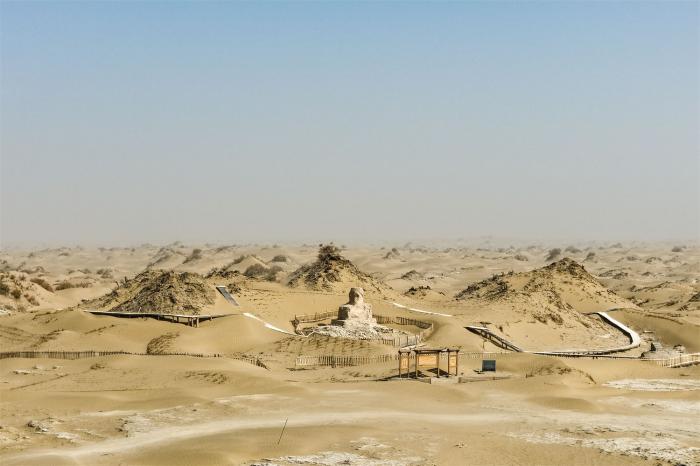 这是尼雅遗址内建筑遗迹等(10月17日摄)。尼雅遗址地处新疆和田地区民丰县尼雅河下游尾闾地带的古三角洲上,是塔克拉玛干沙漠南缘现存规模最大的聚落遗址群,系汉代“精绝国”故地。自1901年斯坦因发现,迄今已逾百年。