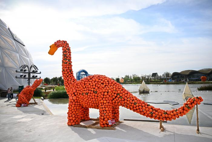 这是景区展示的一处“南瓜恐龙”造型(10月18日摄)。