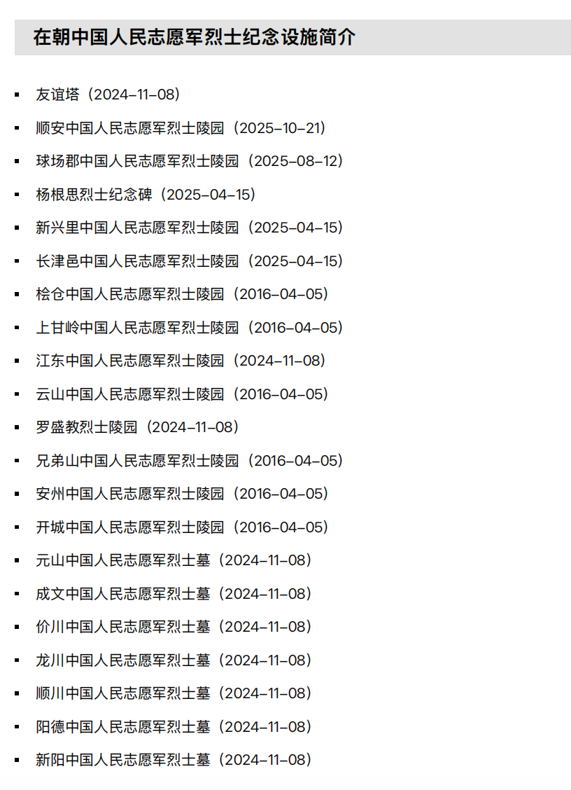 为缅怀告慰先烈,中朝两国政府高度重视在朝志愿军烈士纪念设施修缮保护工作。2011年以来,两国政府有关部门通力合作,先后修缮了桧仓、开城、安州、江东、顺安等5处在朝志愿军烈士陵园。
