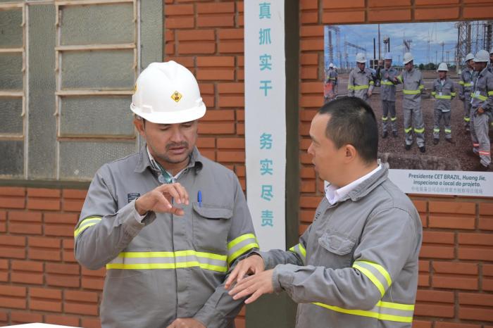 10月4日,在巴西伊瓜苏,中巴工作人员在伊泰普直流改造项目现场交流。