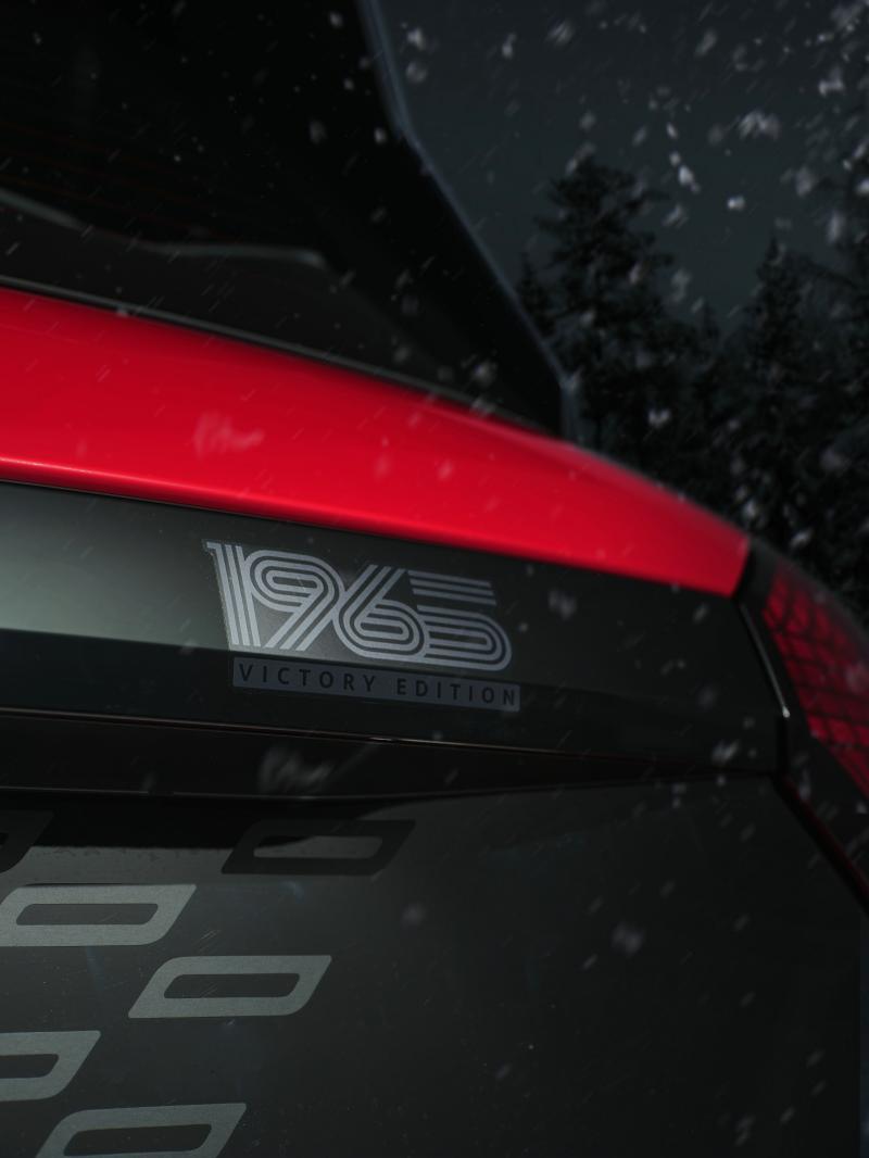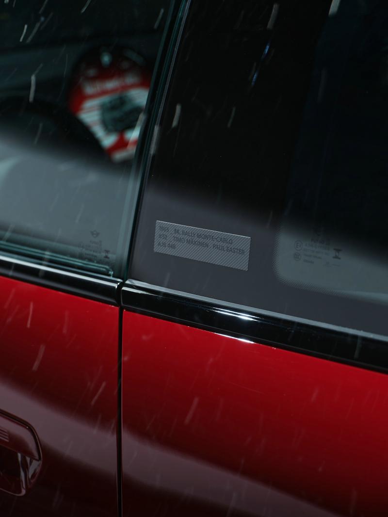 新车以标志性辣椒红车身搭配首次应用于电动JCW车型的蒙特卡洛雪夜限定白顶还原冠军配色,车顶独特的雪地轨迹压纹,还原1965年极端环境中的胜利足迹。雪色轮毂与红色制动卡钳形成鲜明对比,视觉上兼具复古拉力风格与现代运动气质。车身侧面,52号冠军图腾跃然眼前,三道平行线条勾勒出蒙特卡洛拉力赛三冠王的荣耀征程; B柱的1965 纪念铭牌镌刻着参赛车辆及赛车手、领航员身份信息;1965蒙特卡洛胜利纪念标遍布车身,每一处细节都在向那段雪夜征服史致敬。打开车门,1965限定门槛饰板开启时光之门,红色安全带如一道胜利印记贯穿座舱,带上专属 “52号胜利之钥”,它将带你重返“长刀之夜”。