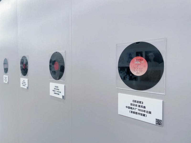 值得一提的是,展厅内一张1951年版《义勇军进行曲》唱片,承载着1949年政协会议上关于国歌的讨论:周恩来同志首先提议以《义勇军进行曲》为国歌,刘良模、梁思成、张奚若等代表亦力荐此曲。针对“中华民族到了最危险的时候”这句歌词,毛泽东、周恩来深刻阐释了“安不忘危”的现实意义,最终会议一致通过将其定为国歌。田汉作为国歌词谱初选委员会成员,亲历了这一历史时刻。展览展出的田汉手稿照片,体现出他将国歌的确立视为“新诗歌音乐界的荣誉”。现场所有实体老唱片均支持扫码试听,观众可聆听不同时期的珍贵录音。
