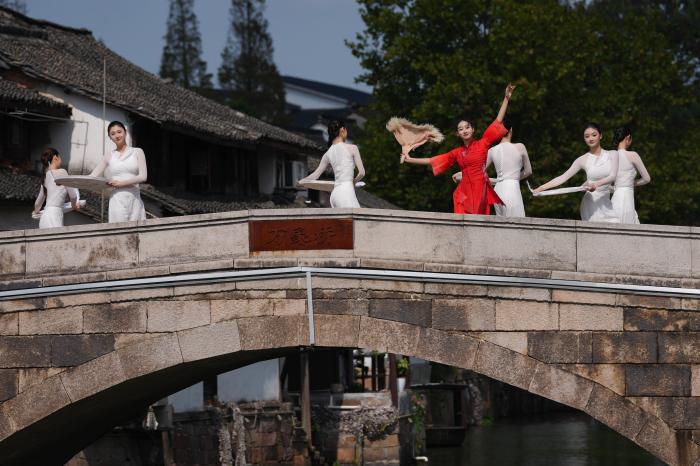 10月24日,表演者在新市古镇万象桥表演民间舞《丝丝簸影》。