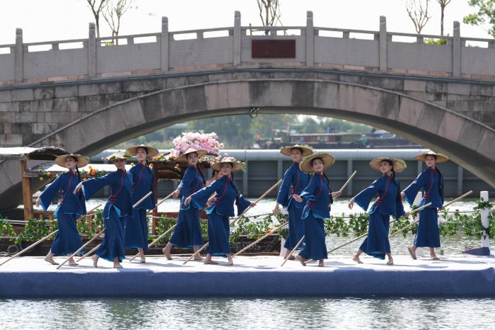 10月24日,浙江音乐学院表演者在新市古镇南栅漾表演舞蹈《烟波唱晚》。