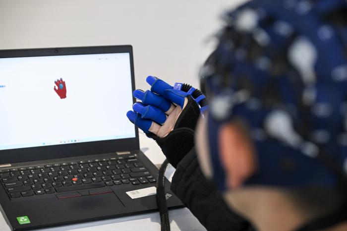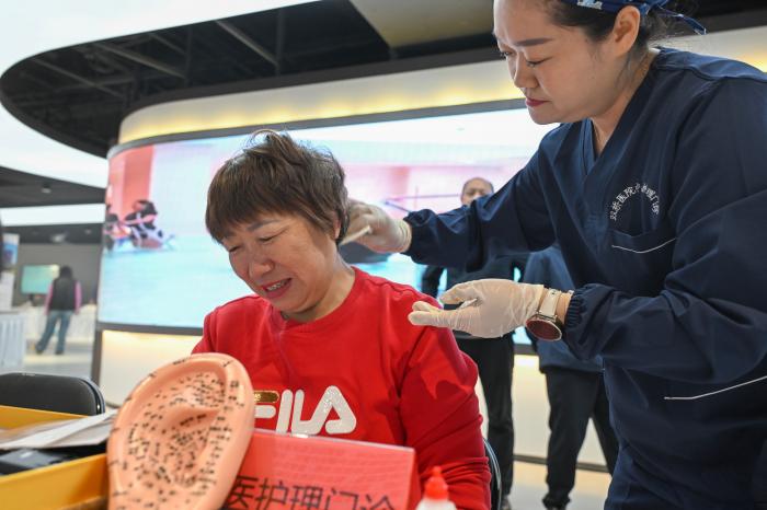 10月25日,工程师在“敬老月”主题活动的养老消费季展厅演示脑机接口手部运动反馈康复训练系统。