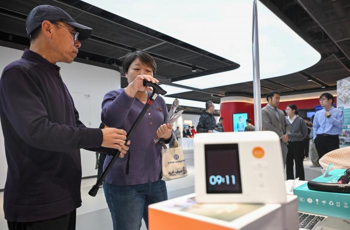 10月25日,市民在“敬老月”主题活动的养老消费季展厅参观一款定位呼叫智能拐杖。