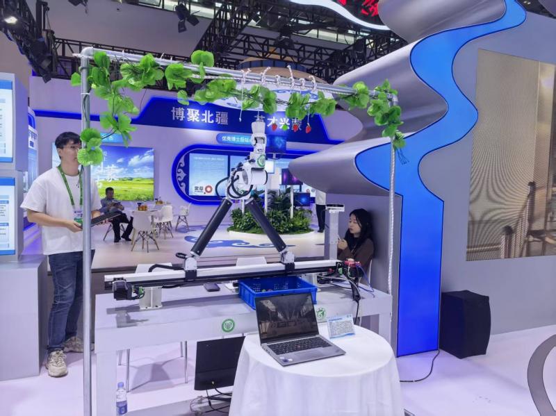 这边进行着“没有硝烟的战争”,各个省份的展区则呈现出科技赋能生活的“烟火气”。在北京展区,一台名为“柔采”的草莓采摘机器人成为焦点。它在模拟高架草莓大棚中灵活作业,搭载的柔性硅胶机械手能通过高清摄像头识别果实颜色和位置,精准采摘成熟草莓,并自动避开未成熟的青果。