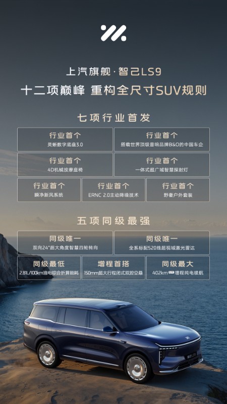 智己LS9首次完整公布了前所未有的"七项行业首发"技术,包括灵蜥数字底盘3.0、世界顶级品牌B&O音响、4D机械按摩座椅等,展现了品牌在前瞻科技领域的绝对领导地位。不仅如此,智己LS9更披露五项“同级最强”配置。驾控方面,同级唯一双向24°超大角度智慧四轮转向系统,成就“最好开的9系”;150mm超大行程闭式双腔空悬,赋予旗舰级全地形征服能力。智己LS9搭载断代领先的恒星超级增程,带来同级最长402kmCLTC纯电续航里程、同级最低2.81L/100km油电综合折算能耗,终结用户的续航与能耗焦虑,实现对同级产品的全面超越。更值得一提的是,智己LS9同级唯一全系标配520线超视域激光雷达,再次突破感知边界。