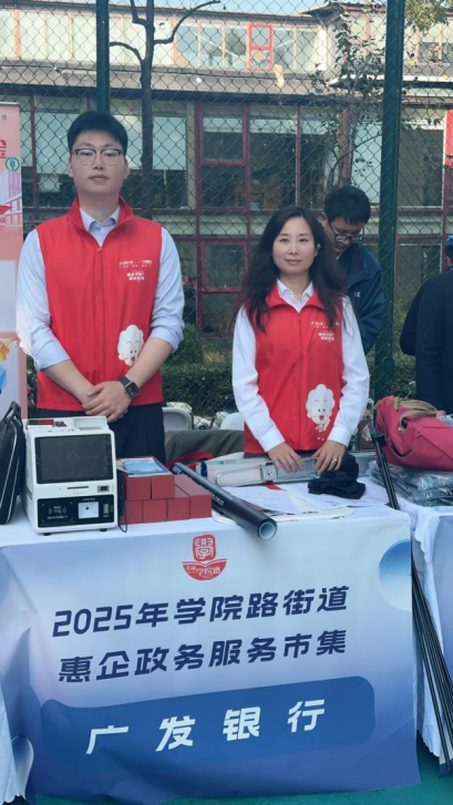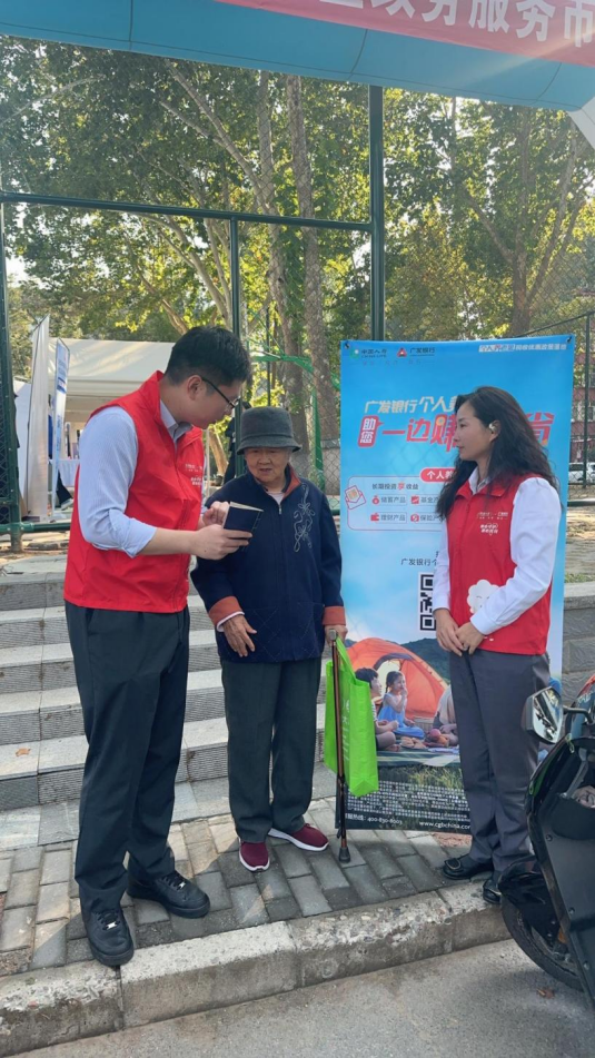 10月14日,广发银行北京分行的青年志愿者们来到学院路街道惠企政务服务市集,面向园区内工作人员及周边老年人开展养老金账户知识宣讲及账户安全防护宣传。
