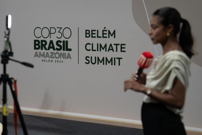 11月6日,一名记者在贝伦气候峰会标识前出镜。