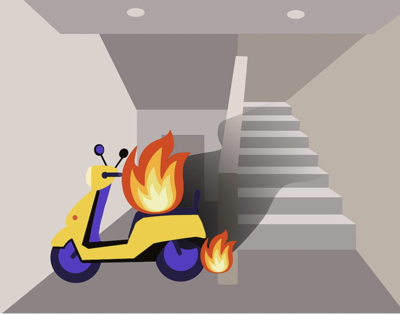 电动自行车停放时,千万不能进楼入户,特别是不能在安全出口、疏散通道这些地方进行停放,一旦发生火灾,会严重影响人员疏散。