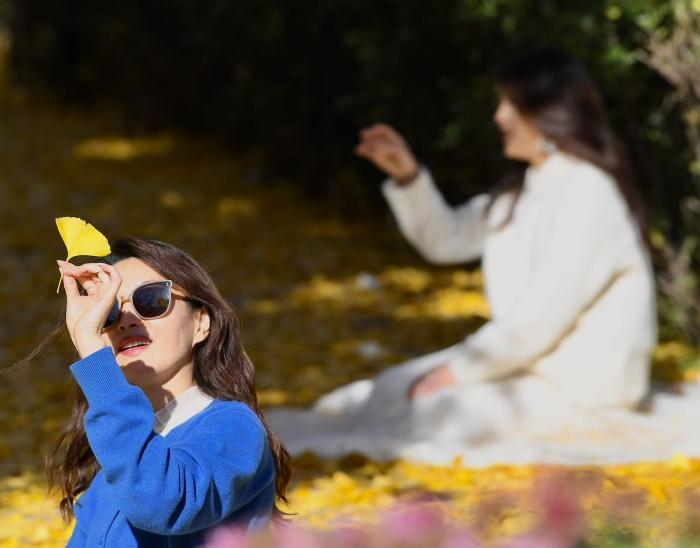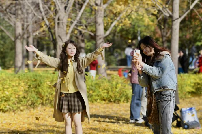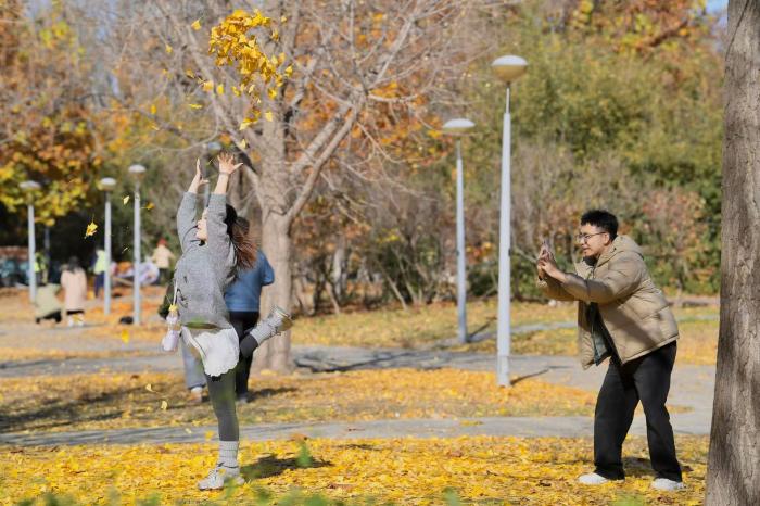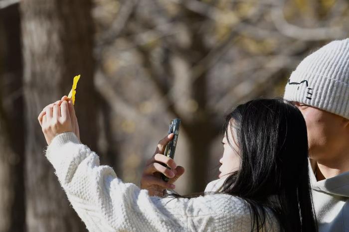 不少年轻人在林中路驻足,或蹲身捕捉叶片纹理,或用相机定格落叶与高塔的同框瞬间,浅色系穿搭与地面金黄相映,随手一拍都是氛围感大片。