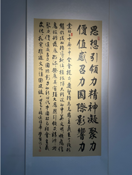 走进国艺美术馆展厅,墨香四溢、气韵生动。一幅幅书法作品或端庄雄浑,或飘逸洒脱,或古朴典雅,篆、隶、楷、行、草各体兼备,风格各异却意境相通。作品内容紧扣时代脉搏,将“文化是一个国家、一个民族的灵魂”“坚持以人民为中心的创作导向”等重要思想以笔墨形式具象化呈现。