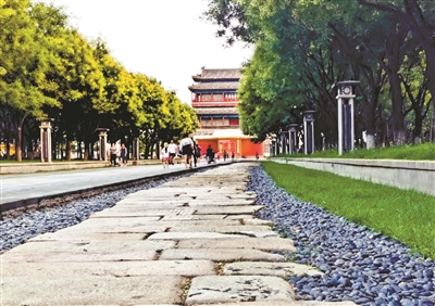 2004年,考古工作者在永定门北侧发现清代石板道遗存,那些带有人工凿刻凹槽的花岗岩条石,终于重见天日。2019年,珠市口至永安路段御道修葺完毕,523米长的石板路严格遵循“修旧如旧”原则,人工凿刻的凹槽复刻着百年前的工艺痕迹,与地下叠压的七层道路遗存形成古今对话。2005年重建的永定门城楼,与复建的御道共同勾勒出中轴线的南端轮廓,使七百年的礼仪长卷得以延续。