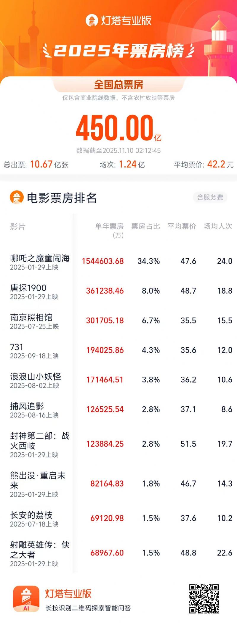 据灯塔专业版数据,截至11月10日,2025年电影大盘票房(含预售)突破450亿,灯塔专业版数据分析师陈晋表示,近期上映的影片有望带动11月中下旬电影大盘实现“触底反弹”。