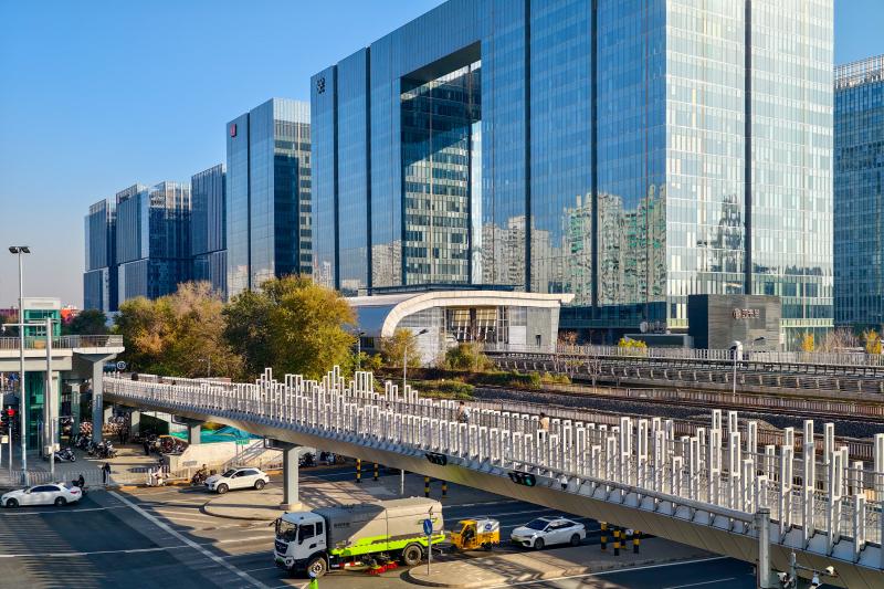 石景山区城管委市政工程科工作人员付佳介绍,该项目桥梁体系分为三层:一层可换乘地铁,同时设置非机动车停车区;二层为行人过街层;三层可换乘快速公交。主桥全长421.8米,四条主桥净宽均为4米。建设中融入多项人性化细节:15厘米高的台阶搭配1:12缓坡梯道方便老人通行,8部自动扶梯、4部垂直电梯及盲道设施,实现全人群无障碍换乘。天桥投用后,行人对角线穿越时间从6分钟压缩至不足2分钟,换乘效率提升超40%;人车彻底分流,机动车通行速度提高3倍以上,路口交通事故率降至零。