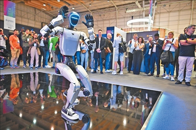 在葡萄牙里斯本举办的2025年网络峰会上,宇树科技的人形机器人和观众互动 新华社发