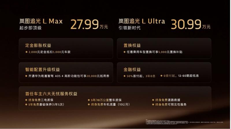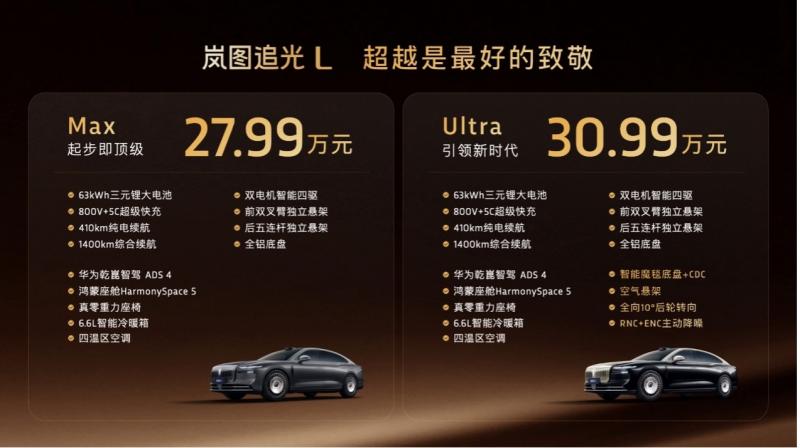 12月10日,新时代旗舰轿车——岚图追光L正式上市,共推出2款版型,售价分别为Max版27.99万元、Ultra版30.99万元。新车同步推出总价值5.2万元的终身免费三电质保、五年免费基础保养等首任车主六大无忧服务权益。