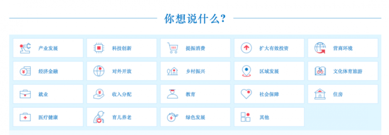 本次活动设“产业发展”“科技创新”“提振消费”“扩大有效投资”“营商环境”“经济金融”“对外开放”“乡村振兴”“区域发展”“文化体育旅游”“就业”“收入分配”“教育”“社会保障”“住房”“医疗健康”“育儿养老”“绿色发展”“其他”等19类话题。