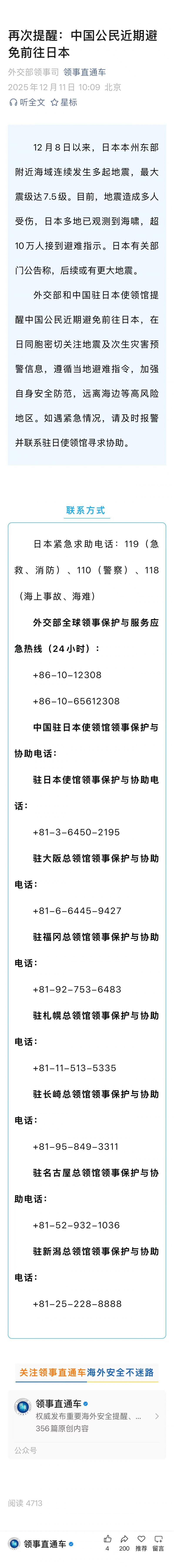 12月11日,外交部领事司通过微信公众号“领事直通车”再次提醒,中国公民近期避免前往日本。
