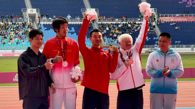 随着当日比赛展开,北京视障选手张鑫乐在T13级男子跳远决赛斩获银牌。到了颁奖仪式,张鑫乐发现,他的颁奖嘉宾正是苏炳添。“确实是苏炳添给我们颁的奖,太激动了,简直太激动了。嗯,真的没有想到苏老师能抽出时间来,能特别关注我们全国残特奥会,还能赶上他给我颁奖。我平时也比较关注他,他的运动员经历是值得我学习的。我知道苏炳添是从受伤状态再恢复,开始修改动作。到后来在奥运会上跑出9秒83的亚洲纪录。他是国内或者亚洲最好的运动员。”