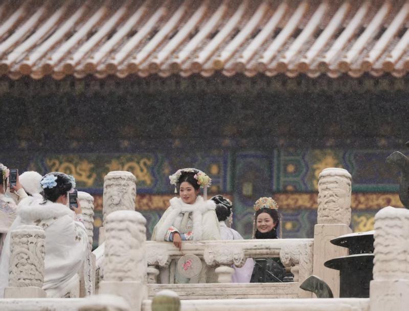 上午时分,雪花开始轻柔地飘落在故宫。众多游客停下脚步,用相机或手机记录下这美丽的雪中故宫。不少身着传统服饰的游客在红墙边留影,有的头戴精致点翠,披着绛红色斗篷,仿佛穿越时空的“格格”;有的梳起旗髻,在飞舞的雪花中定格美丽瞬间,与雪中的宫殿相得益彰,构成了一幅幅动人的画面。
