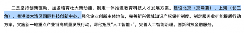 与过去常见的“支持北京、上海、粤港澳大湾区形成国际科技创新中心”等表述相比,这次的提法在“北京”、“上海”后面,分别加上了“京津冀”和“长三角”的括号注解。