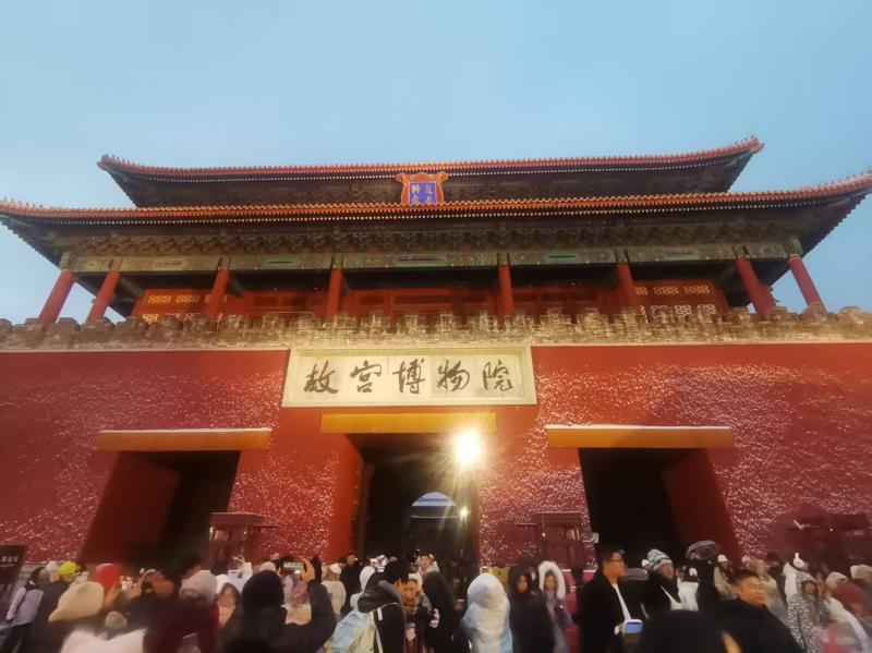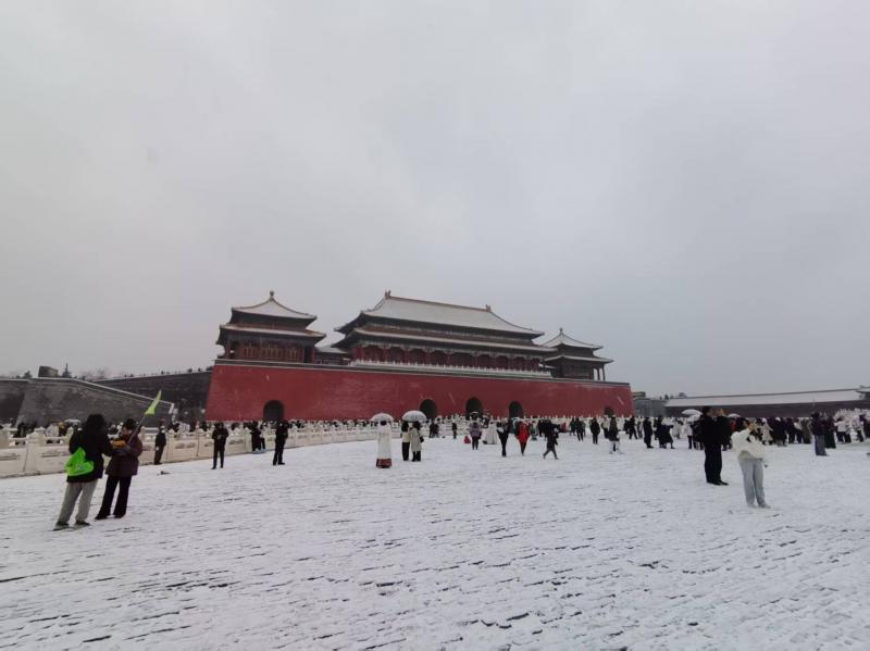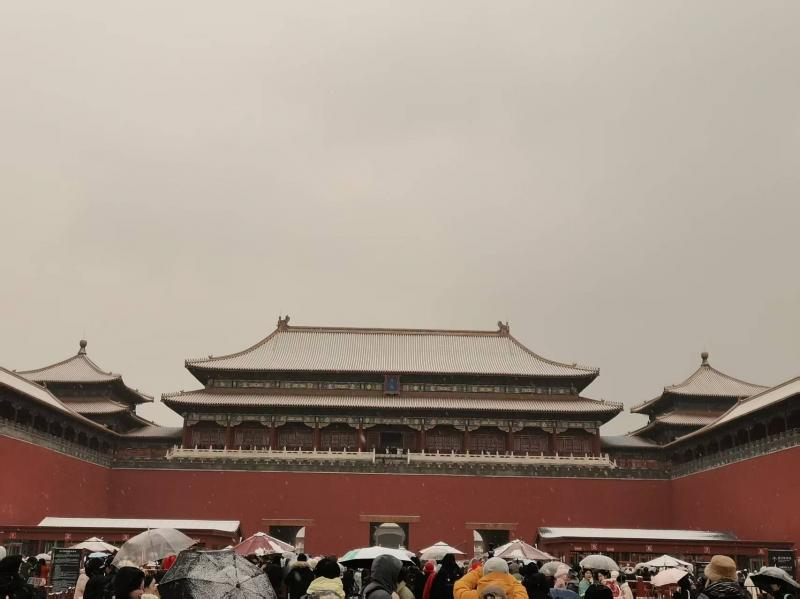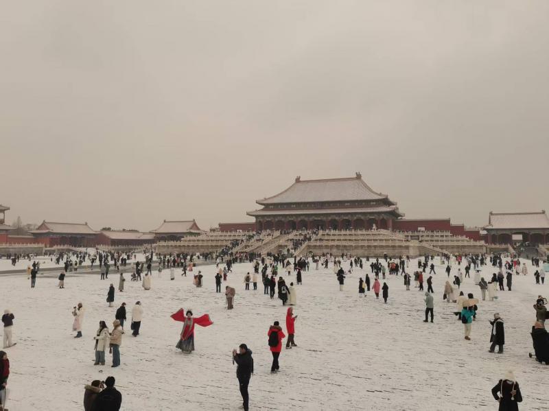 12月12日,京城迎来2025年入冬以来的初雪。故宫雪景吸引大批游客慕名而来,他们有的身着古装站在太和殿广场,在纷纷扬扬的雪花里翩翩起舞;有的徜徉于御花园,拍摄假山上的皑皑白雪;红墙金瓦银装素裹,每一处都是极美的画面。