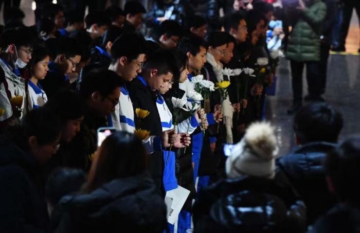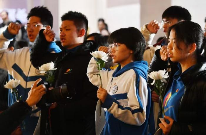 12月13日上午,抗战馆序厅庄严肃穆,参加悼念活动的北京石油化工学院和北京师范大学第二附属中学的师生代表、各界群众代表等200余人手持鲜花,默然肃立。