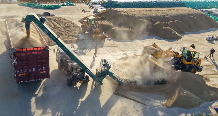 10月14日,在北大荒集团黑龙江共青农场有限公司粮贸中心,铲车在进行粮食清选工作(无人机照片)。新华社发(李昂摄)