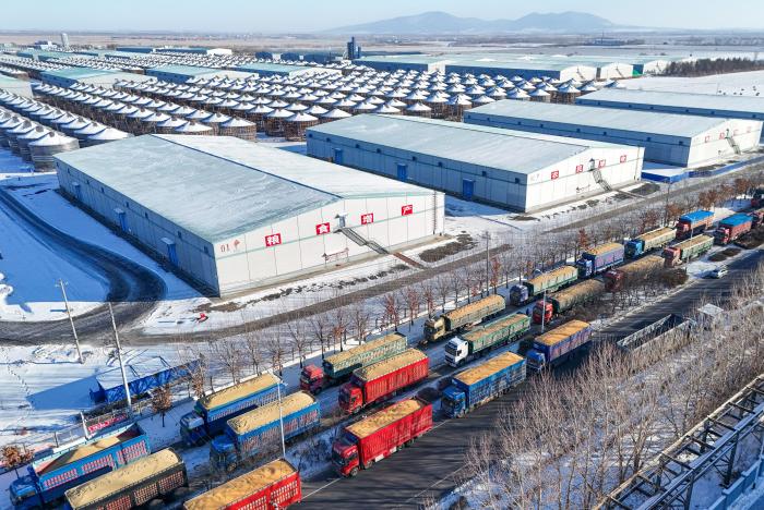继2024年粮食总产量首次突破1600亿斤之后,今年粮食总产量再度突破1600亿斤,连续16年位居全国第一。12月12日,送粮车在黑龙江省富锦市一粮食收储企业门前排队(无人机照片)。新华社发(曲玉宝摄)