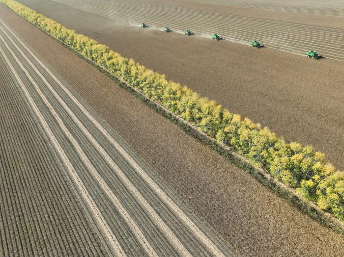 9月30日,在北大荒集团黑龙江大西江农场有限公司第五管理区,大型收割机在大豆种植地块进行收获作业(无人机照片)。新华社发(林进春摄)