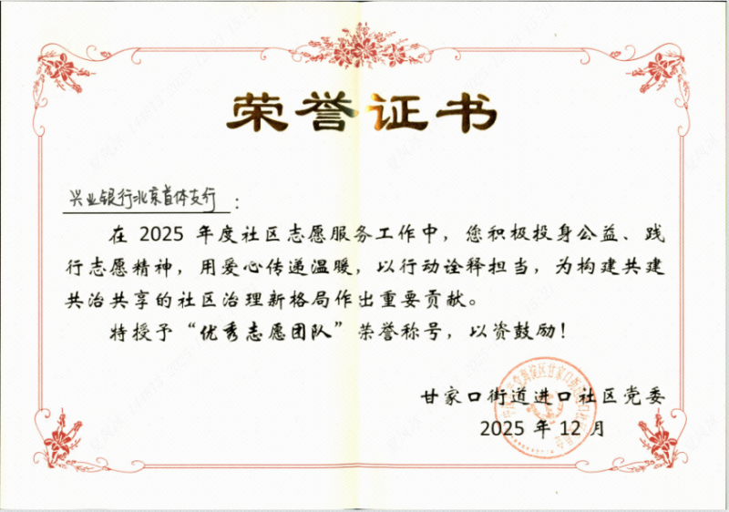 近日,兴业银行北京分行首体支行迎来一份暖心荣誉--在2025年12月甘家口街道进口社区举办的年度总结会上,支行凭借在社区志愿领域的亮眼表现,被授予“优秀志愿团队”称号,这份荣誉既是社区对支行服务的认可,更是“兴公益”品牌深耕社区、践行普惠的生动见证。