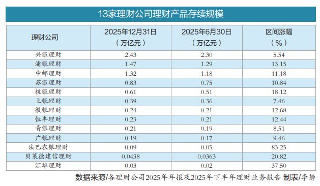 据中国证券报记者梳理,截至目前,已披露2025年度业绩的13家理财公司分别是兴银理财、浦银理财、中邮理财、苏银理财、杭银理财、上银理财、徽银理财、恒丰理财、青银理财、广银理财、法巴农银理财、贝莱德建信理财和汇华理财。