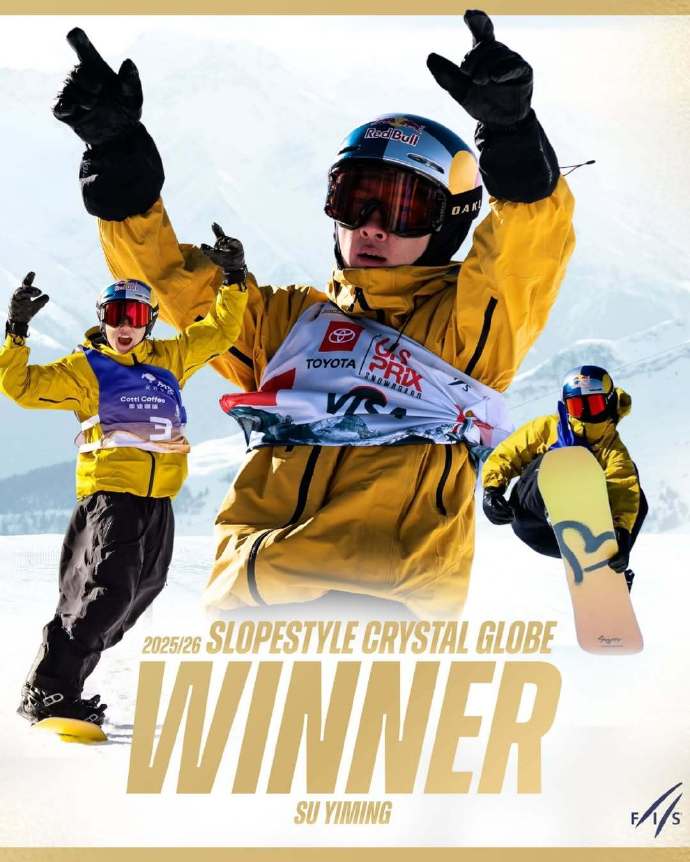 3月28日,国际雪联官宣,2025-2026赛季国际雪联单板滑雪男子坡面障碍技巧世界杯赛季总冠军归属中国选手苏翊鸣。凭借本赛季的稳定发挥与出色战绩,苏翊鸣以140分高居积分榜榜首,成功摘得该项目赛季水晶球奖杯。此前,苏翊鸣已拿下本赛季单板滑雪大跳台世界杯总冠军。苏翊鸣成为中国单板滑雪首位单赛季包揽两大项目世界杯赛季总冠军的选手,书写中国冰雪运动新历史。