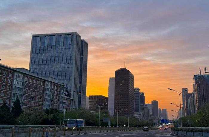 4月21日清晨,一场温柔的朝霞为北京披上了梦幻外衣。天际线处,淡粉与橙红交织的霞光从地平线晕染开来,将长安街车流、CBD楼宇与故宫角楼都镀上了一层柔光。