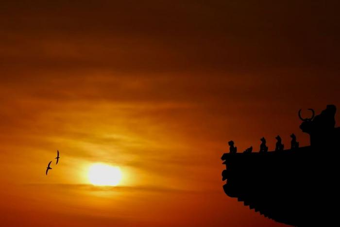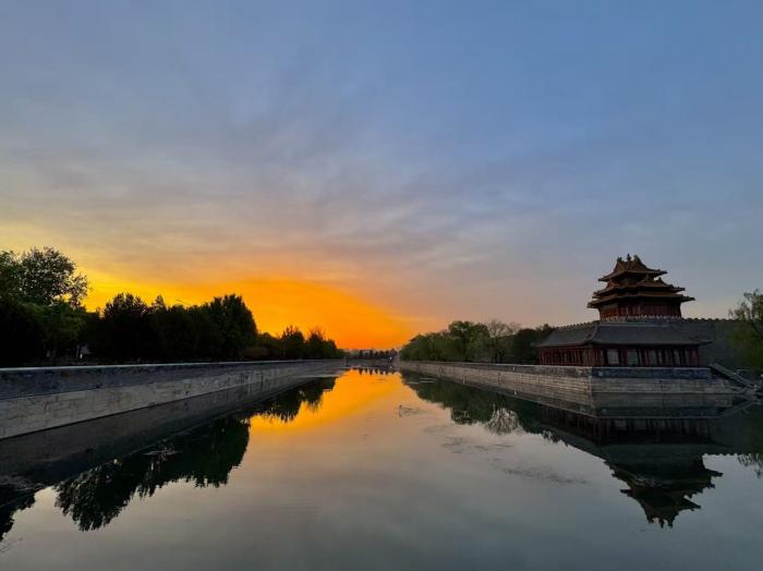 晨曦初露,故宫角楼的飞檐剪影,与筒子河水面的倒影相映成趣。