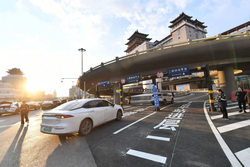 当天清晨,北京青年报记者在现场看到,北广场螺旋盘道双向车道布局保持不变,路面平整、护栏牢固、标识清晰;二层落客平台拆除原有安检进站棚,车道由4条拓宽至5条,大幅提升车辆落客与通行效率。