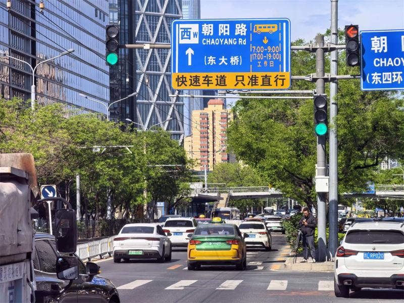 早上9点,北青报记者在朝阳路看到,虽然已过早高峰,路面车流仍处于高位运行,道路中央主路最外侧BRT2线使用的公交专用道已调整为工作日7至9时、17至19时启用,社会车辆按照指示标志进入公交专用道行驶,道路运行基本畅通。