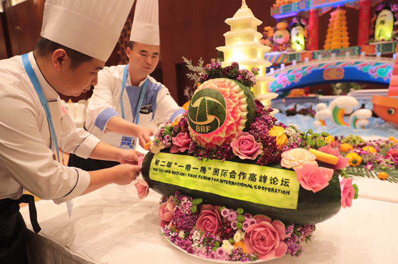 在为高级别会议参会代表准备的大宴会厅里,“一带一路”特色的餐饮摆台共有60余组, “楼兰绿洲梦”、“鱼跃龙门通四海”、“共建双赢阁”……每个摆台都有个漂亮的名字,既结合了高峰论坛主题,又融入了共建“一带一路”国家的风土人情和文化内涵。