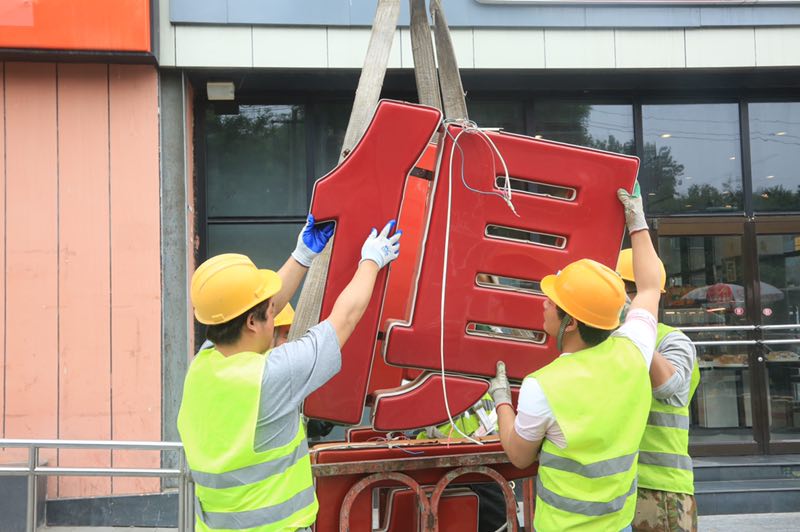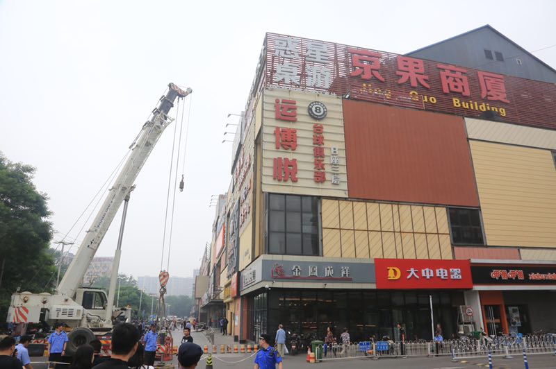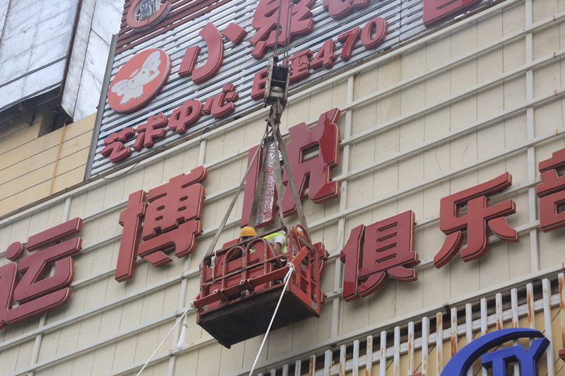 北青报记者在现场看到,京果大厦门前拉起了警戒线。警戒线内,一辆大吨位的吊装车停放妥当,工作人员坐着升降机缓缓升到半空,开始了对这座大厦34块违规广告牌的拆除工作。“根据相关规定,除了一层门店正上方的门牌,二层以上的牌匾都属于违规牌匾。”北下关街道城管执法队相关负责人说,经前期详细摸排,京果大厦共有各类牌匾73块,其中超大、超宽、超高、一店多牌等违规牌匾共计34块。