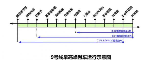 需要提醒乘客注意的是:早高峰期间进城方向有3列区间车以丰台科技园为始发站,有2列区间车分别以白堆子、六里桥站为终点站。晚高峰期间出城方向有2列车分别以白堆子、六里桥站为始发站,有3列区间车以丰台科技园为终点站。