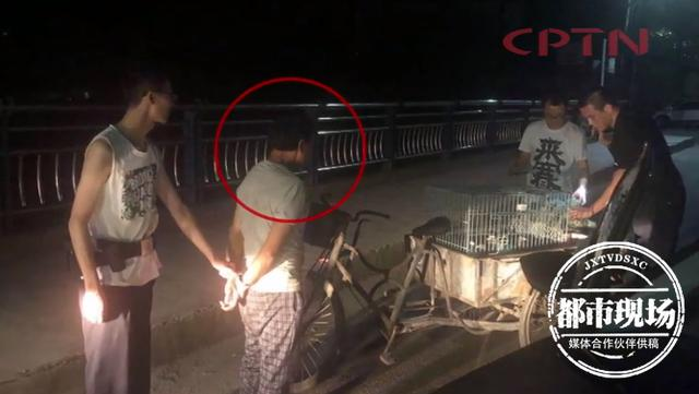 民警蹲守后,发现疑似嫌疑人骑着一辆人力三轮车从一老旧小区出来,当场人赃俱获,嫌疑人三轮车上拉着4只鸽子、1只鸭子和4只鸡。