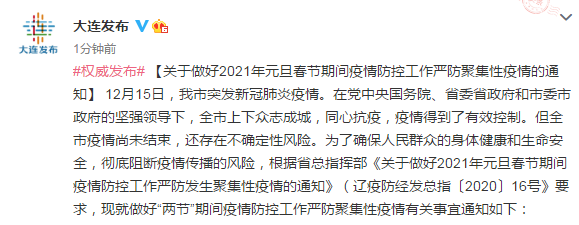 12月15日,我市突发新冠肺炎疫情。在党中央国务院、省委省政府和市委市政府的坚强领导下,全市上下众志成城,同心抗疫,疫情得到了有效控制。但全市疫情尚未结束,还存在不确定性风险。为了确保人民群众的身体健康和生命安全,彻底阻断疫情传播的风险,根据省总指挥部《关于做好2021年元旦春节期间疫情防控工作严防发生聚集性疫情的通知》(辽疫防经发总指〔2020〕16号》要求,现就做好“两节”期间疫情防控工作严防聚集性疫情有关事宜通知如下: