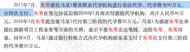 2017年7月,时任汨罗市委常委、副市长的朱苇委托私企业主马某帮其联系代孕机构进行非法代孕,代孕费为90万元,分四次支付。